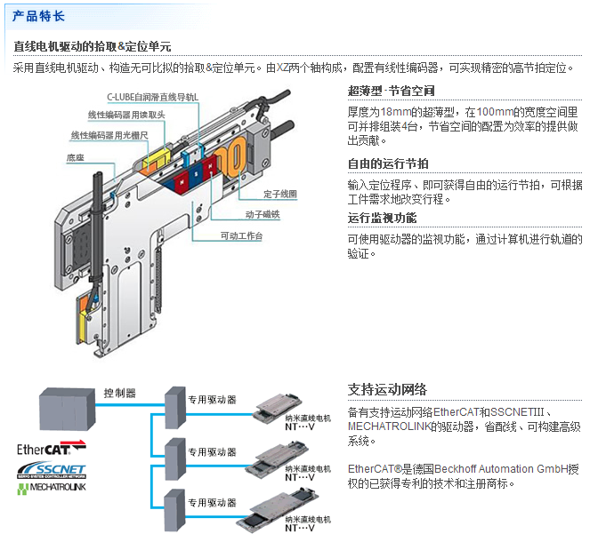 可动工作台的导向部采用在小型直线导轨设备领域评价颇高的IKO直线导轨,通过搭配直线电机和高分解能线性编码器,实现了高精度定位。通过采用高性能钕磁石,可获得大推力,虽然是极小型,也可实现高速、高响应性定位。此外,采用无电线的划时代驱动方式,机械接触部分只有直线导轨设备, 因此可实现高洁净度。纳米直线电机NT最适合用作半导体、液晶相关生产装置和要求具有清洁环境的检查装置、电子零件组装装置等的紧凑型定位机构。"