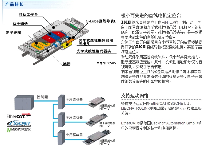 纳米直线定位工作台NT在钢制可动台上配置磁铁和光学式线性编码器用光栅尺,钢制底座上配置定子线圈、线性编码器头等,是一款紧凑型功能出色的直线电机定位台。定位工作台导向部采用实现了5年或20,000km免维护的IKOC-Lube直线导轨L,有利于减少维护所需的人工。