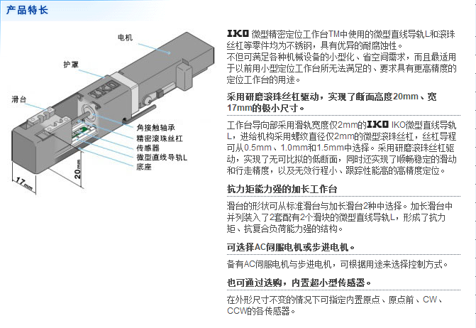 微型精密定位工作台TM装有在超小型装置领域获得良好口碑、滑轨宽2mm的IKO微型直线导轨L和丝杠直径2mm的精密磨削研磨滚珠丝杠,是一款极小型精密定位工作台。