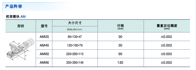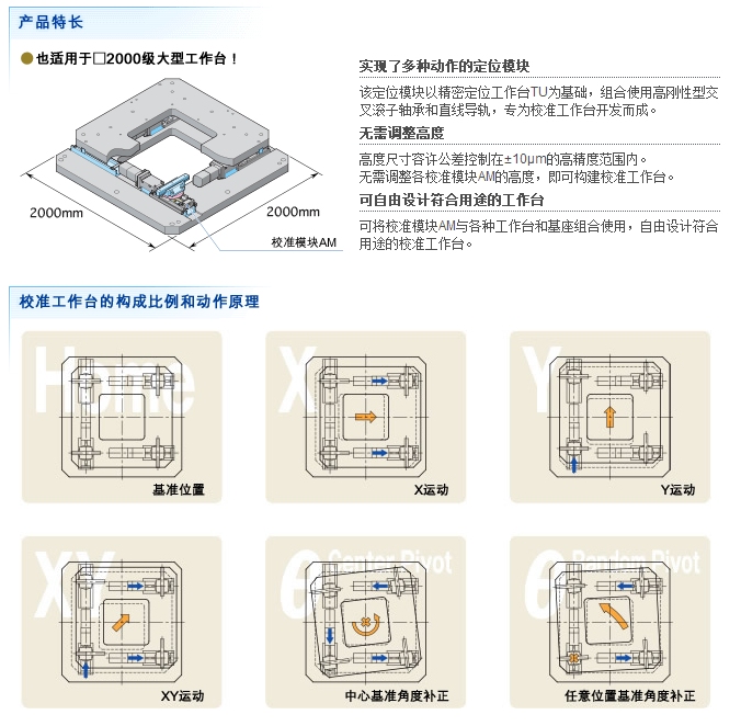 校准工作台AM组合了精密定位工作台TU、高刚性型交叉滚子轴承和直线导轨E,是专为校准工作台而开发的定位模块。 高度尺寸的容许公差控制在±10μm的高精度范围内,无需调整各校准模块的高度即可构建校准工作台。