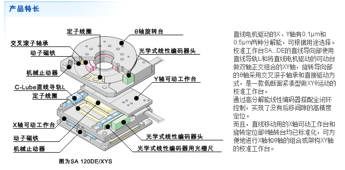 直接驱动型校准工作台SA...DE的直线导向部使用IKO自润滑直线导轨L,旋转导向部使用IKO交叉滚子轴承,驱动部采用直接驱动方式,是一款低断面紧凑型做XYθ运动的校准工作台。校准工作台SA...DE通过高分解能线性光栅尺搭配全闭环控制,实现了没有后移间隙的高精度定位。 最适合于用作半导体和液晶制造设备等利用图像处理进行校准处理以及要求清洁环境的测量仪器和检验设备等的定位机构。
