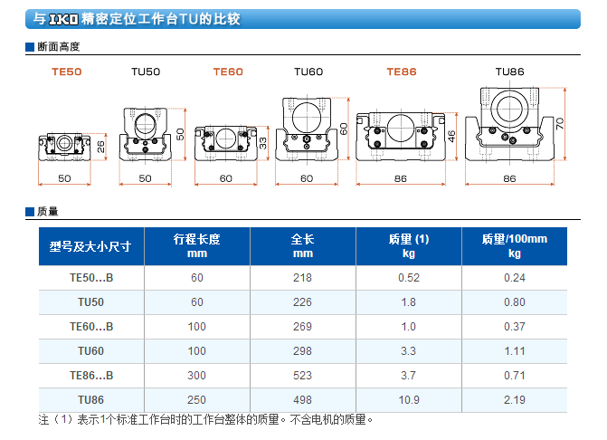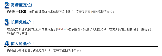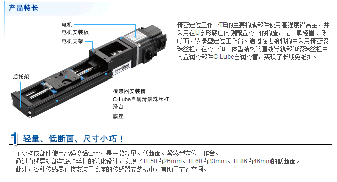精密定位工作台TE的主要构成部件使用高强度铝合金,并采用在U字形底座内侧配置滑台的构造,是一款轻量、紧凑型定位工作台。进给机构中采用精密滚珠丝杠,可靠性高,可实现高精度定位。通过在直线导轨设备内部和滚珠丝杠中内置润滑部件C-Lube自润滑管,实现了长期免维护,可削减为润滑而加油的工时。可自由设定滚珠丝杠的导程、电机的种类、传感器的安装等各种规格,根据用途设计最佳的定位工作台。最适用于从零部件加工、组装、检查、搬运装置等需要高定位精度的装置到一般搬运领域的各种用途。