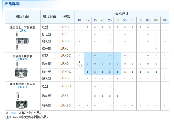 相同的断面尺寸有短型,标准型,高刚性加长型,超高精度?超高刚性加长型4种不同的滑块长度,可根据用途适当选择。