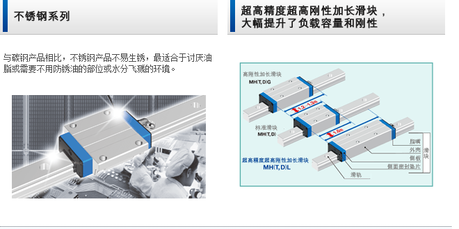滑块和滑轨可分别单独订货,故型号、精度、预压等可自由搭配,是一款高次元互换性系统产品。只要对传统的自由互换规格的直线导轨更换滑块就能免维护。